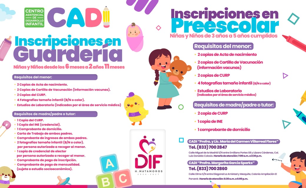 El Sistema para el Desarrollo Integral de la Familias Matamoros, informa a la población sobre el periodo de inscripción a guardería y preescolar para niñas y niños desde los 6 meses hasta los 2 años 11 meses de edad y de 3 a 5 años en los Centros Asistenciales de Desarrollo Integral que pertenecen a este organismo, siendo un espacio especializado en el cuidado, atención y desarrollo integral de la primera infancia.