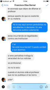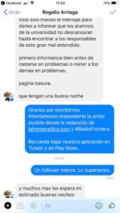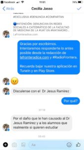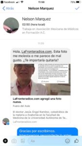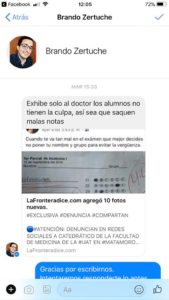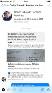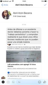Ya para la medianoche los insultos subieron de tono y me extraño ver como médicos y doctoras de bata blanca y estetoscopio al cuello deseaban la muerte incluso a quienes formamos esta empresa periodística, porque quizá lo que no entendieron en las múltiples respuestas que se les ofrecieron es que lafronteradice no tiene la culpa de los equívocos de su profesor, el Ramírez, que por cierto emitió un escueto comunicado a través de su Facebook anunciando o que se separaba voluntariamente de la docencia “en virtud de una serie de injurias sobre mi persona emitidas en redes sociales por personas desconocidas” y que dejaba en manos de la casa de estudios la investigación en su contra para determinar si actuó bien o mal durante estos años de exhibir a sus estudiantes.