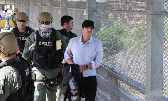 on la cara cubierta, cruzaron la placa que marca los limites de México y Estados Unidos, rodeando a un hombre menudo, delgado, que cargando una maleta negra, escudriñaba el paisaje del Río Bravo.Para la entrega, agentes de los dos países determinaron cerrar a la circulación vehicular y peatonal el cruce, por lo que decenas de automóviles permanecieron a mitad del puente, uno de los 4 que comunica Matamoros con Brownsville.