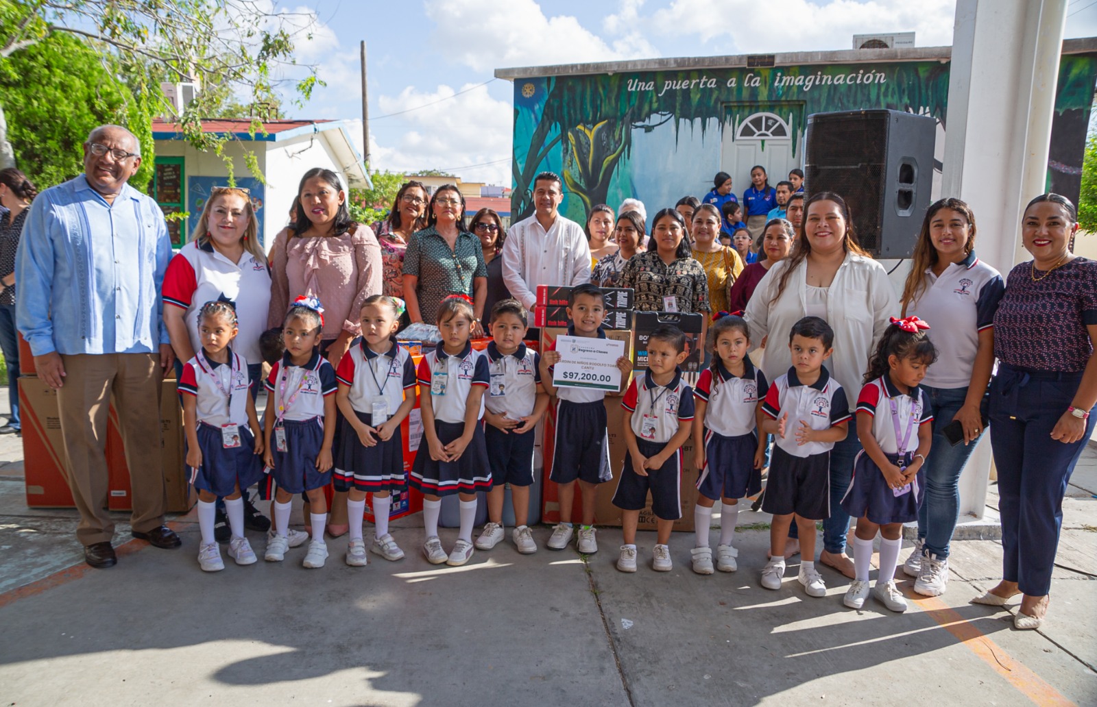 Los apoyos entregados a 15 planteles educativos de nivel preescolar y primaria consistieron en aparatos de aire acondicionado, equipos y papelería de oficina, entre otros.