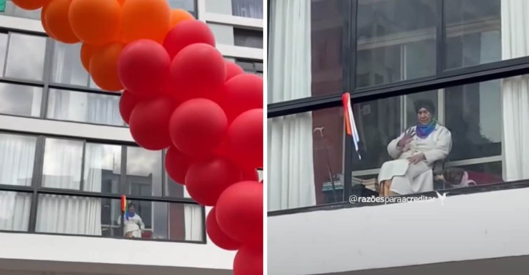 Un ejemplo de ello fue una anciana que fue grabada desde la avenida por un asistente, donde se pudo ver que se sentó cómodamente frente a la ventana de su departamento para ver el desfile y saludar a todas las personas desde su sitio.