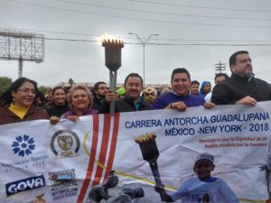 Cientos de feligreses recibieron la tarde de este jueves a la antorcha Guadalupana, a su llegada a esta ciudad fronteriza, con una gran coordinación por parte del Dr. Nicolás Leal Cisneros, la antorcha llegó y fue llevada a la Iglesia de Guadalupe, para seguir su destino que es llegar a Nueva York a donde deberá llegar el próximo 12 de diciembre.