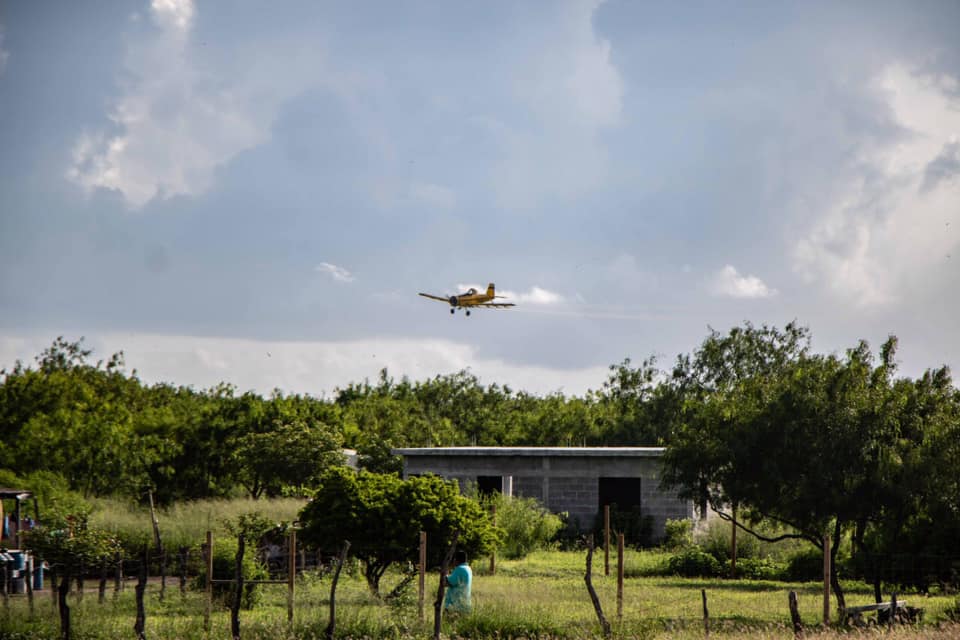 La avioneta contratada por el Gobierno Municipal de Matamoros inició los trabajos de abatización en ejidos del sur-oriente de la ciudad, entre ellos, el Moquetito, Francisco I. Madero, Pacheco, Laguna Honda, 5 de Mayo y Quijano.