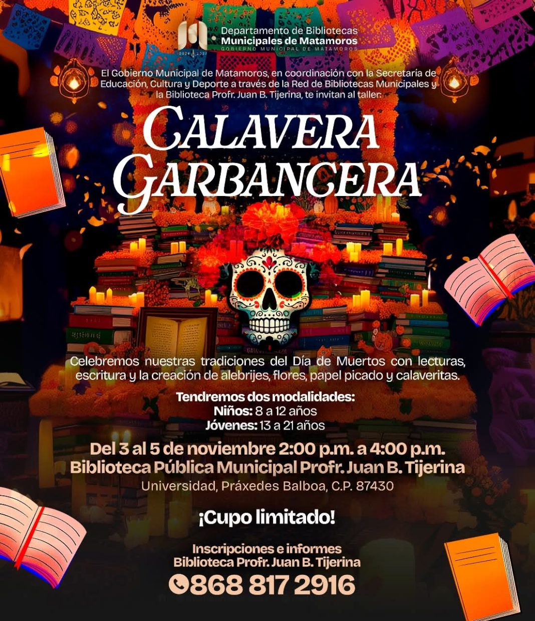 Durante tres días, los participantes elaborarán alebrijes, flores de papel, papel picado y calaveritas, fomentando el amor por nuestras tradiciones mexicanas. Será del 3 al 5 de noviembre, de 2:00 a 4:00 de la tarde, en la Biblioteca Pública Municipal Prof. Juan B. Tijerina