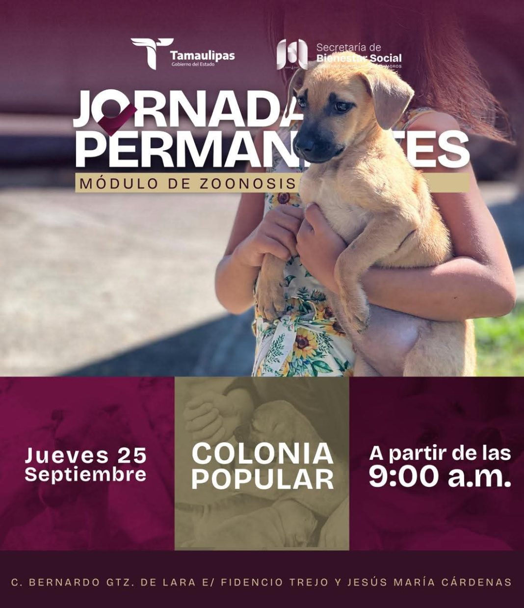 El alcalde Beto Granados invita a las familias de la Colonia Popular a participar este jueves 25 de septiembre, a partir de las 9:00 de la mañana en la jornada que realizará el Módulo de Zoonosis, ofreciendo atención y asesoría para el bienestar de perros y gatos.