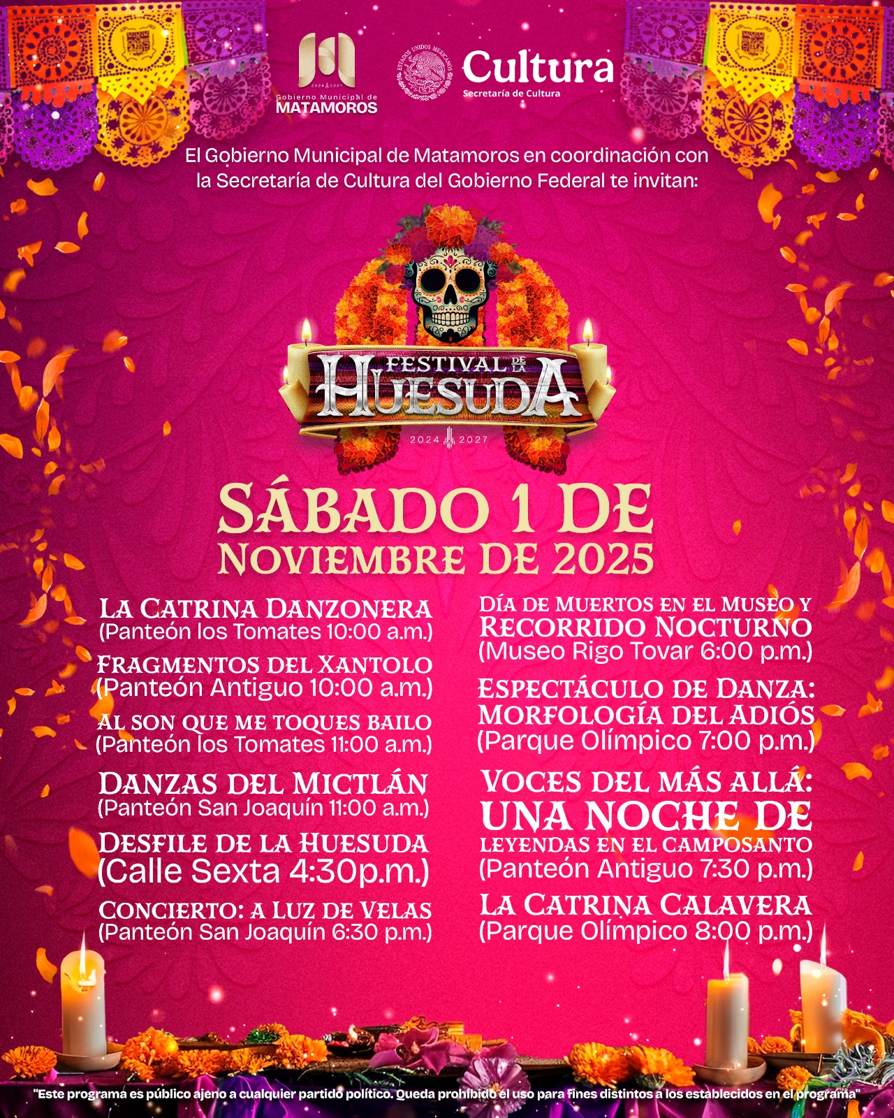 El alcalde Beto Granados invita a los matamorenses a disfrutar del Festival de la Huesuda 2025, que continúa este sábado 1 de noviembre con un día lleno de tradición, arte y cultura que te hará vibrar.