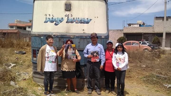 En recuerdo al ídolo de la Primera de Mayo, Rigo Tovar, fanaticos del centro del país posan junto al autobús localizado en Santa María Tonanitla, Estado de México, muy lejos de su natal Matamoros.