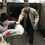 Un grupo de civiles emerge de un vehículo blindado, con algunos enseres en la mano, un perro y un gato. Después de meses bajos...