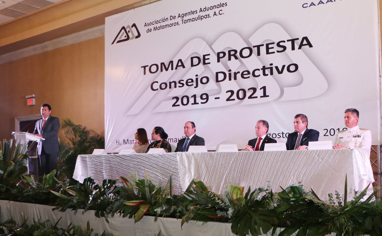 El alcalde Mario Alberto López Hernández durante la toma de protesta de la nueva directiva de la Asociación de Agentes Aduanales de Matamoros, los convocó a invertir en México.