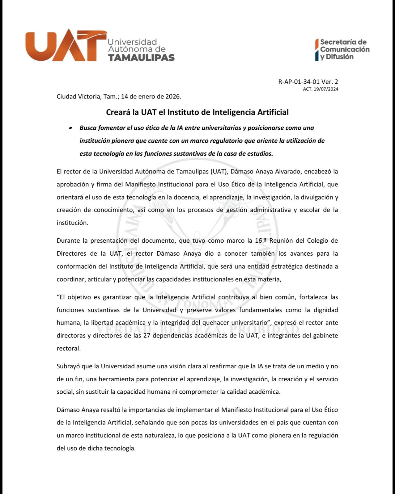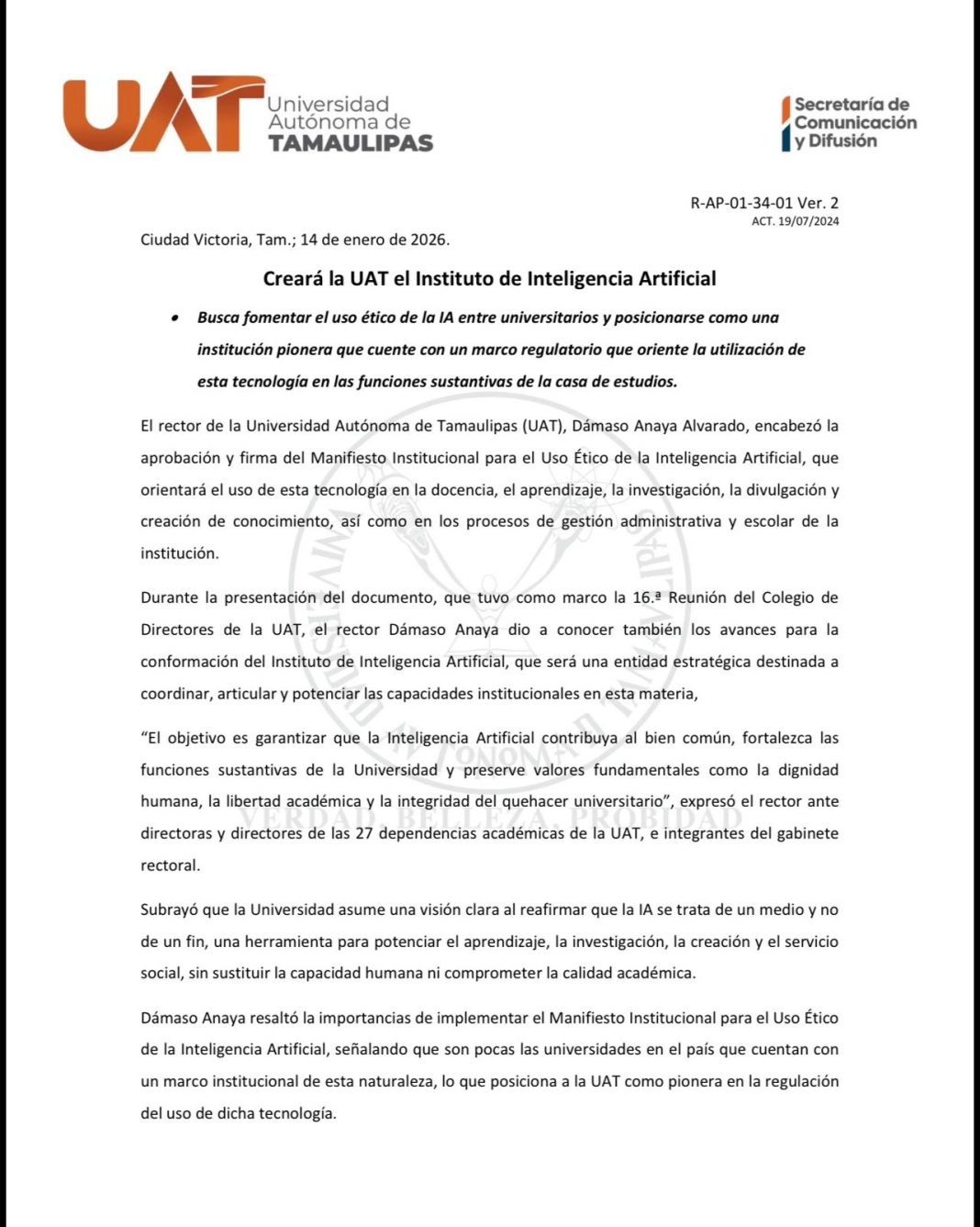 El rector de la Universidad Autónoma de Tamaulipas (UAT), Dámaso Anaya Alvarado, encabezó la aprobación y firma del Manifiesto Institucional para el Uso Ético de la Inteligencia Artificial, que orientará el uso de esta tecnología en la docencia, el aprendizaje, la investigación, la divulgación y creación de conocimiento, así como en los procesos de gestión administrativa y escolar de la institución.