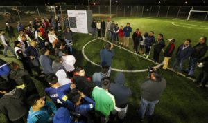 Al concluir su mensaje, el Presidente Municipal acompañado de decenas de deportistas se trasladó a una de las porterías para realizar un tiro de gol, con lo cual, quedó oficialmente inaugurada la cancha deportiva, esto, a pesar de las bajas temperaturas y la lluvia que se registraba en ese momento.