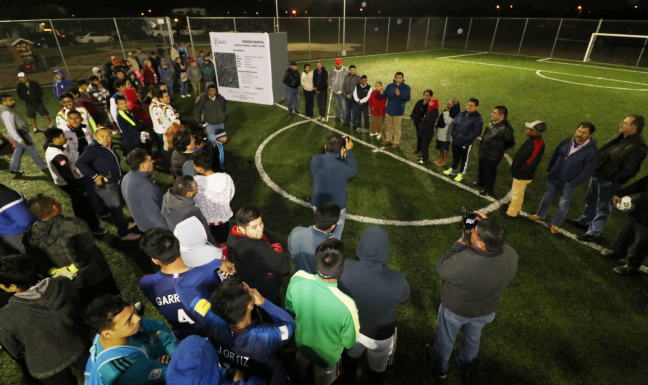 A la cancha de fútbol 7 se le colocó pasto artificial con caucho, alumbrado público en todo el perímetro, andadores de concreto, así como también está protegida con una barda malla de tela ciclónica de 2 metros y medios para resguardo y su conservación.