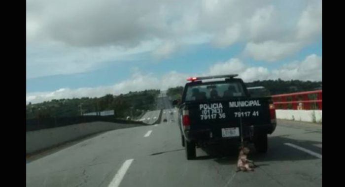 Las imágenes muestran a la patrulla número 0069 que circula y lleva el cuerpo de una mascota, amarrado y arrastrando.