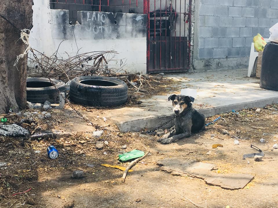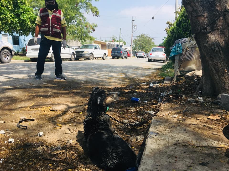 Durante el recorrido de la Secretaría de Bienestar Social y de Espacios Públicos por el fraccionamiento San Pedro, se encontró un perro en muy malas condiciones además de encadenado a un árbol.