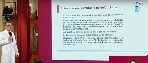 El Instituto Mexicano del Seguro Social (IMSS) detectó que 957 personas murieron a causa del COVID-19 antes del 10 de junio, pero que, sin embargo, no habían sido reportadas por lo que no aparecen en los registros de la Secretaria de Salud, informó Víctor Hugo Borja Aburto, director de Prestaciones Médicas del instituto.