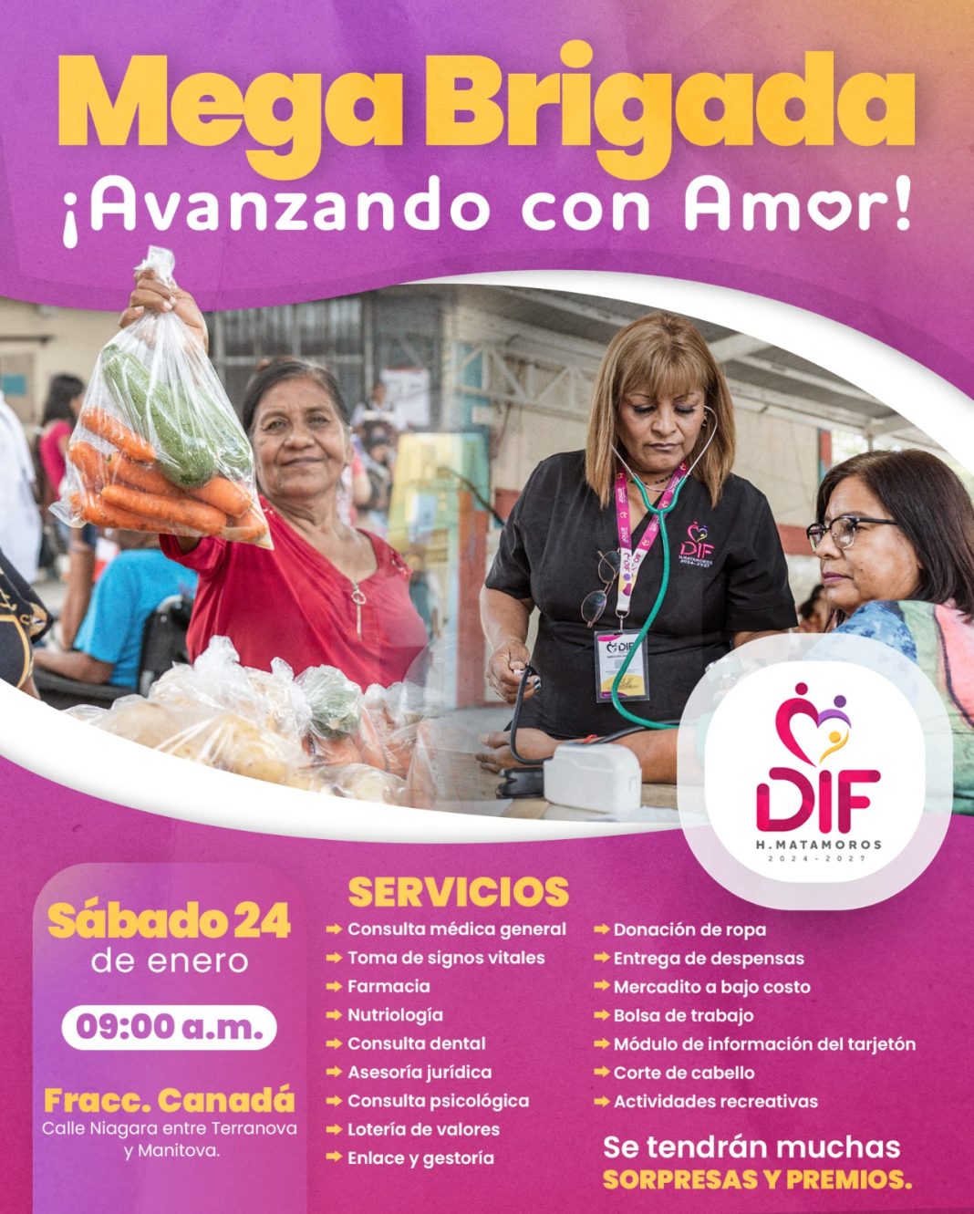 El Sistema DIF Matamoros que preside la Lic. Ana Ariceaga de Granados, invitan a las familias del Fraccionamiento Canadá y alrededores, a asistir a la Mega Brigada Asistencial, en donde se acercarán los diversos servicios que se ofrecen de manera gratuita.