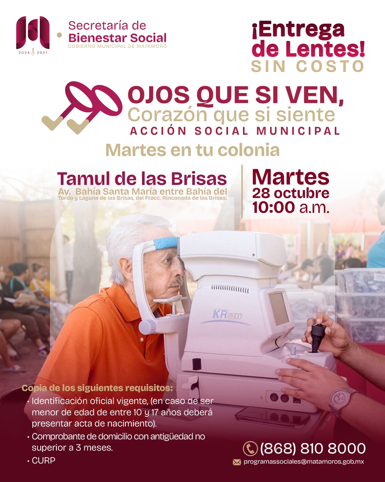 Además de la entrega de lentes, se brindará información sobre otros programas sociales y de apoyo municipal, con el objetivo de fortalecer la participación ciudadana y mejorar la calidad de vida de nuestra comunidad.