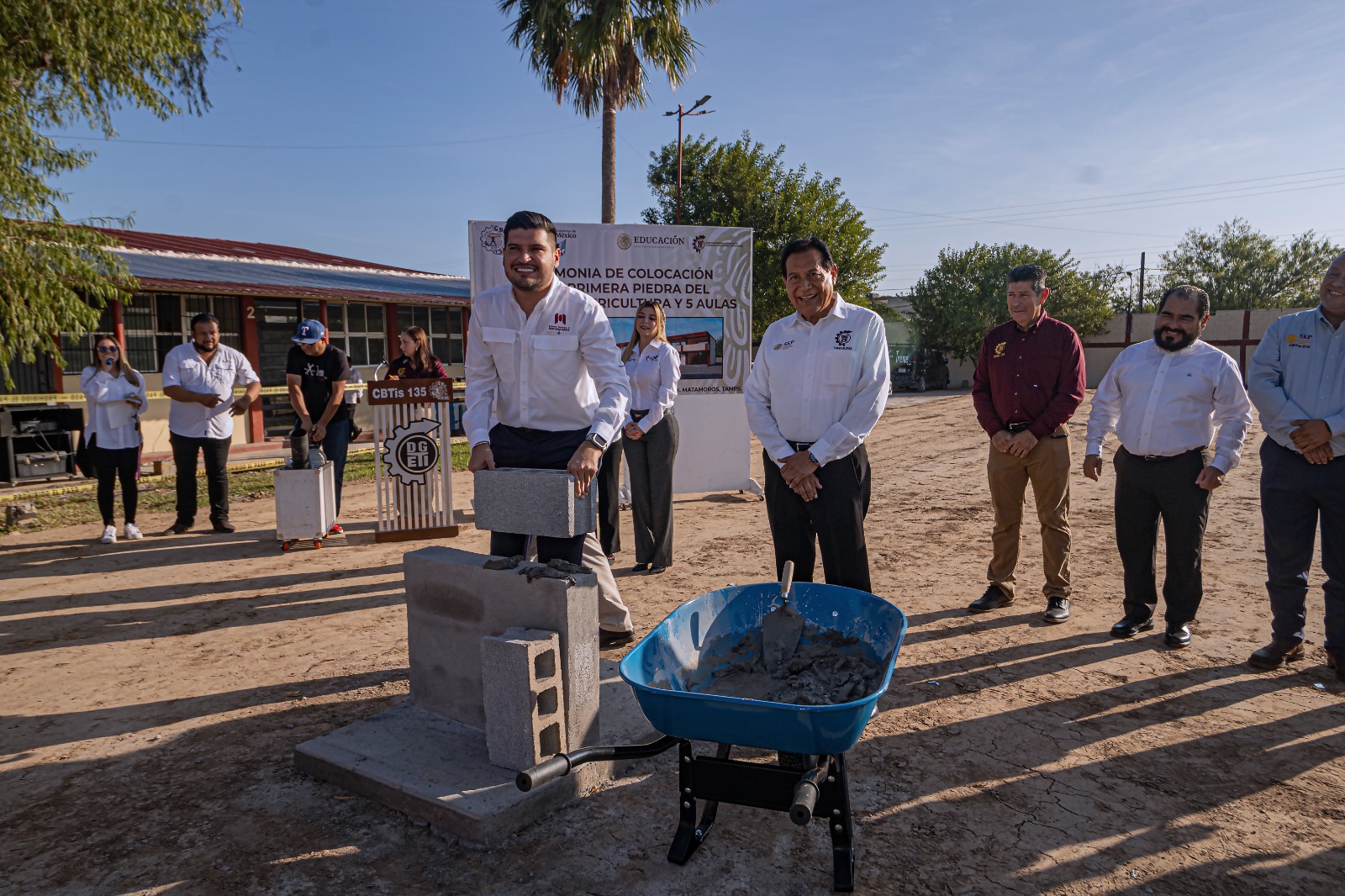De forma visionaria y entusiasta el alcalde y autoridades educativas colocaron la primera piedra de lo que serán cinco aulas nuevas y el Taller de Puericultura que beneficiará a los más de 3 mil 200 alumnos que conforman este importante plantel en Matamoros y Tamaulipas que ha destacado a nivel nacional.