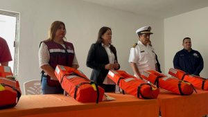 Con la representación del alcalde Mario Alberto López Hernández, la secretaria de Bienestar Social, Saraí Martínez Dragustinovis, acompañada de directivos de la dependencia municipal y de la Capitanía del Puerto entregaron un total de 34 chalecos salvavidas.
