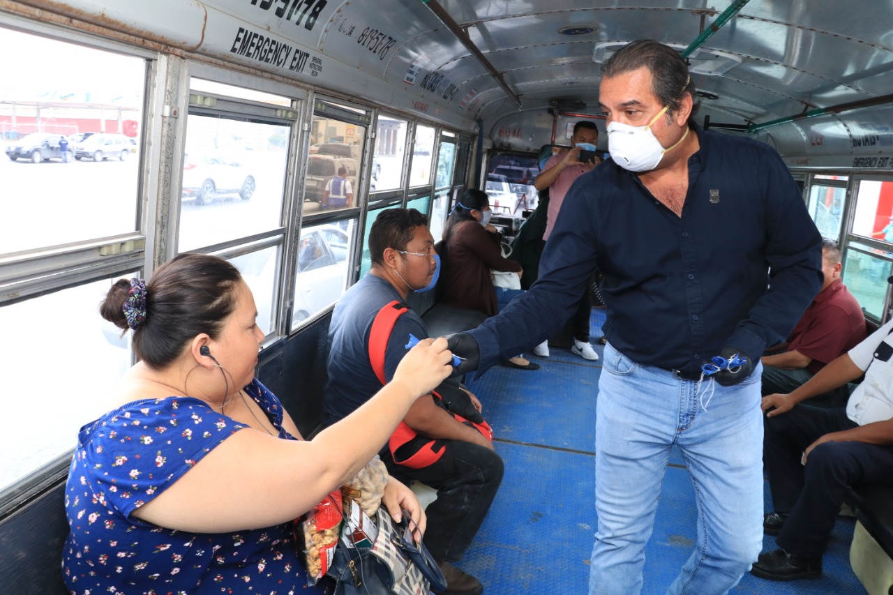 En el operativo de este sábado, el director de Tránsito Local también subió a las unidades de transporte público para exhortar a los usuarios a protegerse en esta contingencia que se vive a nivel mundial.