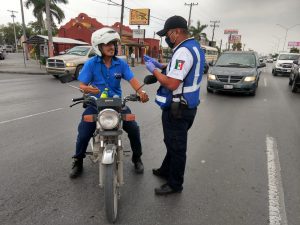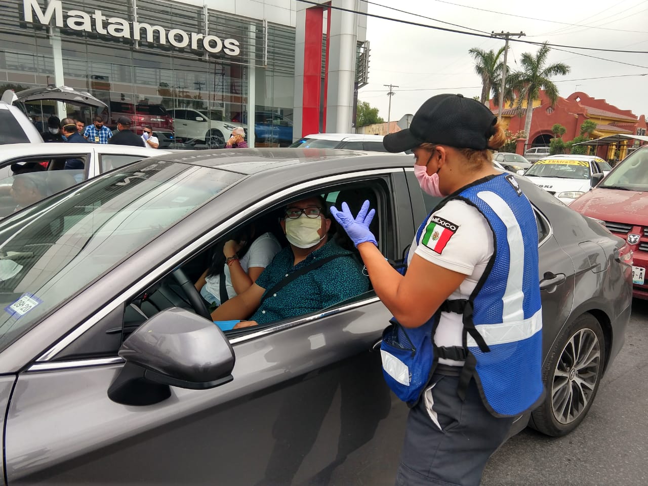 Elementos de Tránsito Local, encabezados por Jorge Mora Solalinde realizaron un operativo en el crucero de Sexta y boulevard Manuel Cavazos Lerma para entregar cubre bocas a automovilistas y pedir que solo salgan a la calle cuando se trate de un asunto escencial.