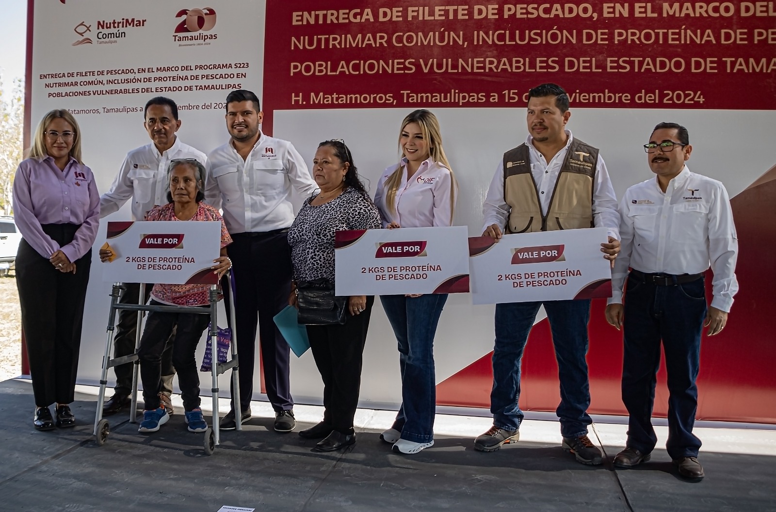 La actividad, enmarcada dentro del programa Nutrimar Común, beneficiará a múltiples familias matamorenses, al proporcionar un alimento altamente nutritivo y de gran calidad sanitaria. El presidium estuvo conformado por el presidente municipal Granados, el subsecretario de Pesca y Acuicultura, Ing. Jorge de Jesús Montagner Mendoza; la presidenta del Sistema DIF Matamoros, Lic. Ana Ariceaga de Granados; el rector regional de Bienestar Social Estatal, Daniel Cruz Lerma; la secretaria de Bienestar Social, Lic.Perla Guadalupe Medina Ruiz; el director de Extensionismo Pesquero y Acuícola, Ing. Celestino Martínez Bernal; y la beneficiaria del programa, Sra. María Magdalena Hernández Almaraz.