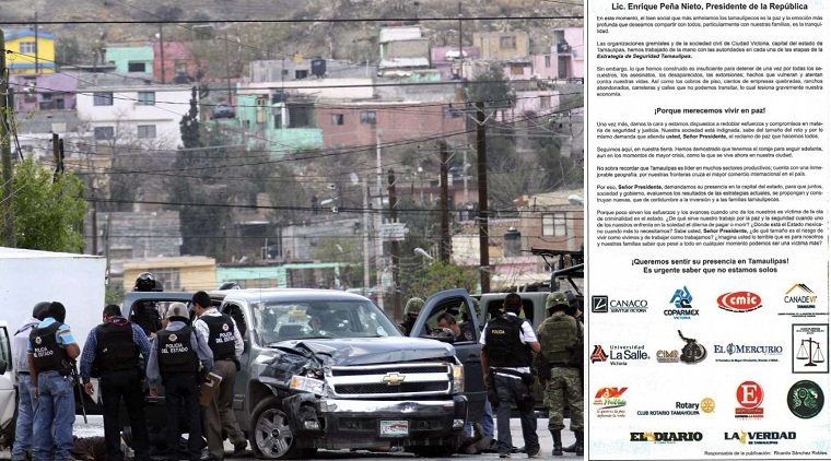 En el desplegado, urgen al presidente Enrique Peña Nieto a acudir a Tamaulipas: “Demandamos su presencia en la capital del estado, para que juntos, sociedad y gobierno evaluemos los resultados de las estrategias actuales, se propongan y construyan nuevas, que dé certidumbre a la inversión y a las familias tamaulipecas”.