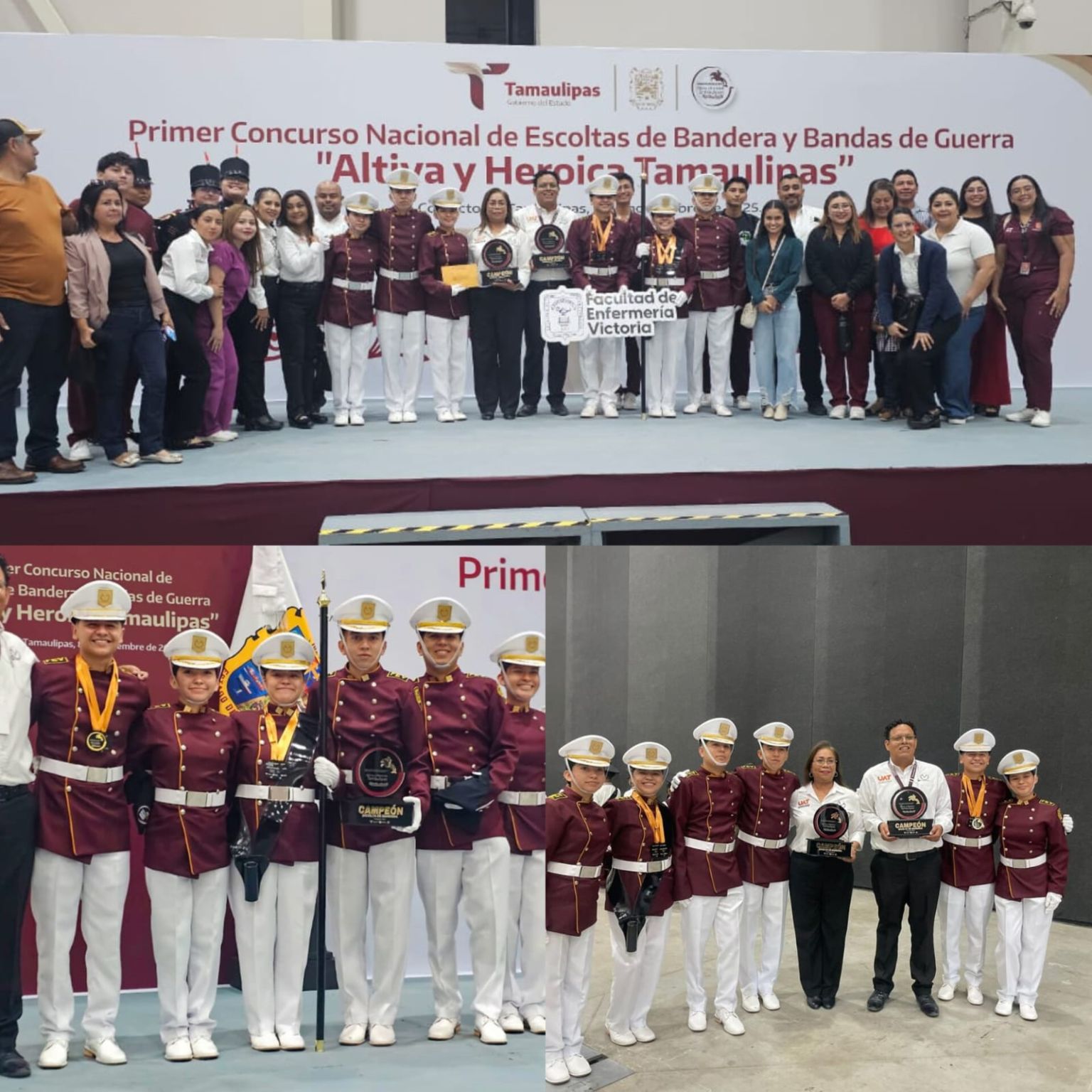 Con gran orgullo institucional, la Facultad de Enfermería Victoria de la Universidad Autónoma de Tamaulipas (UAT) obtuvo el primer lugar en las categorías Nivel Superior y Libre del Primer Concurso Nacional de Bandas de Guerra y Escoltas de Bandera “Altiva y Heroica Tamaulipas”, organizado por el Gobierno del Estado y celebrado este 8 de noviembre en el Polyforum de Ciudad Victoria.