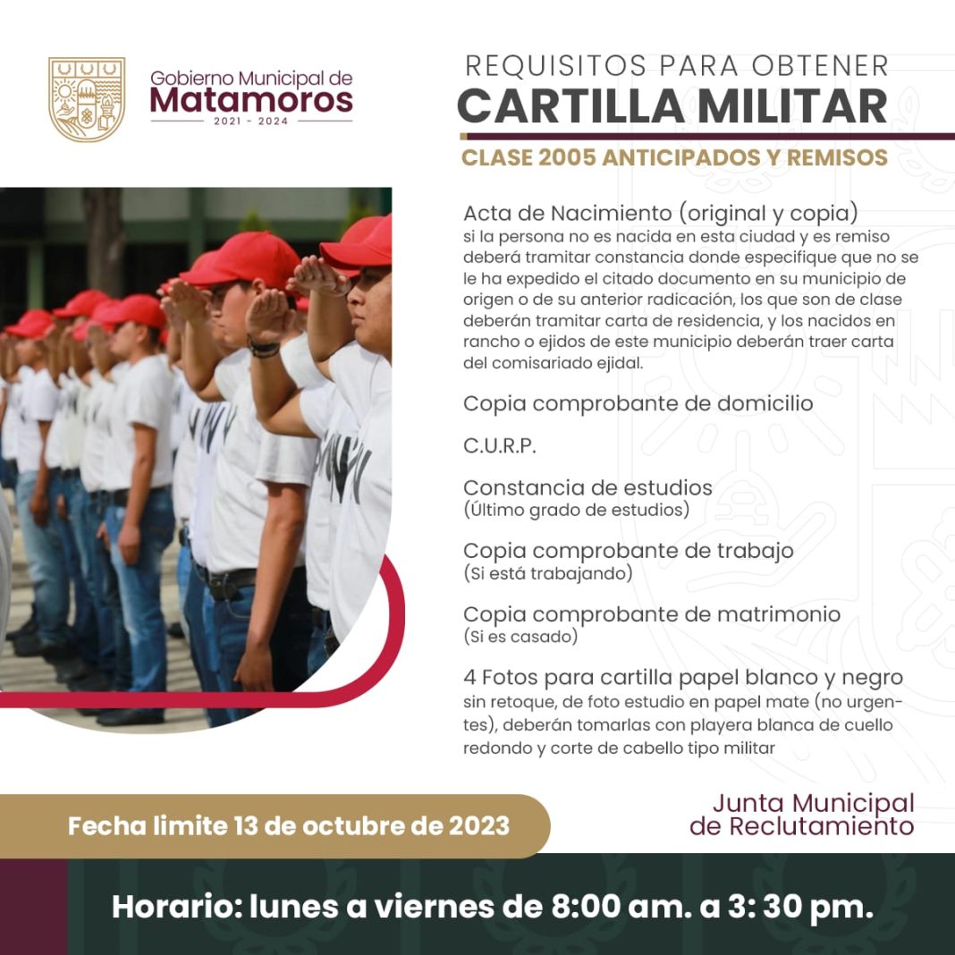 El Gobierno de Matamoros a través de la Junta Municipal de Reclutamiento invita a los jóvenes de la clase 2005 anticipados y remisos a tramitar su cartilla militar.