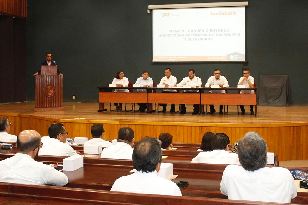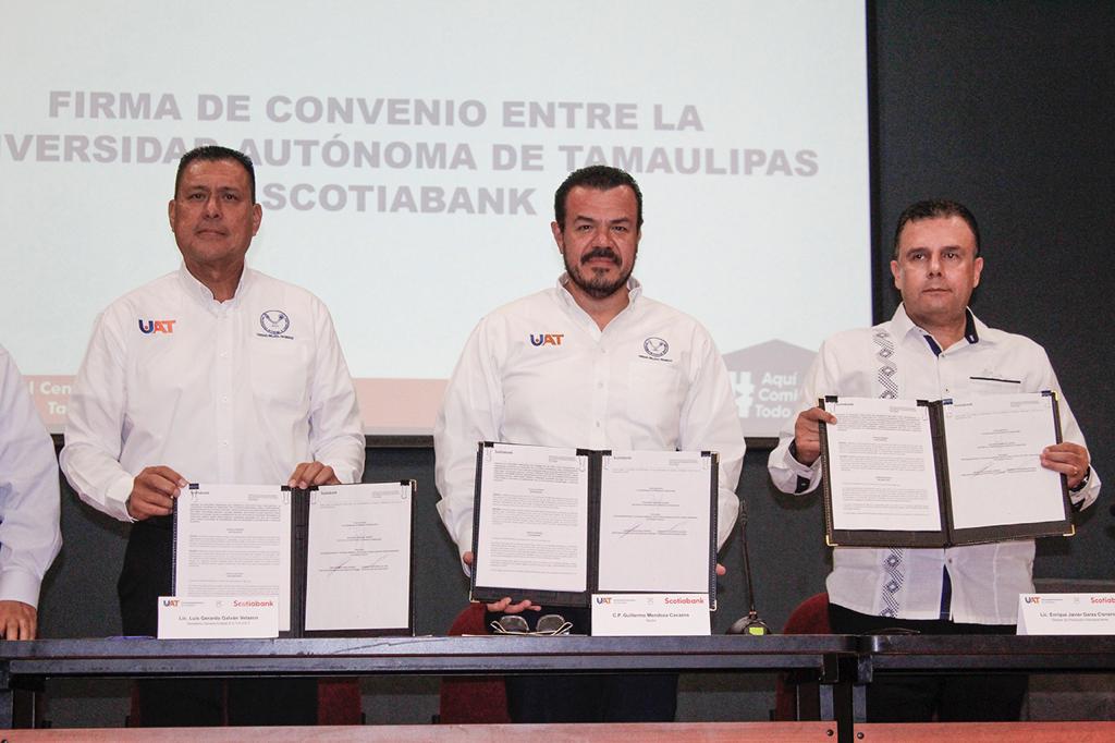 En el Campus Tampico se llevó a cabo la firma de un convenio de colaboración que presidió el rector Guillermo Mendoza Cavazos con la institución financiera Scotiabank, para seguir fortaleciendo el fondo destinado al personal docente de carrera al servicio de la UAT.