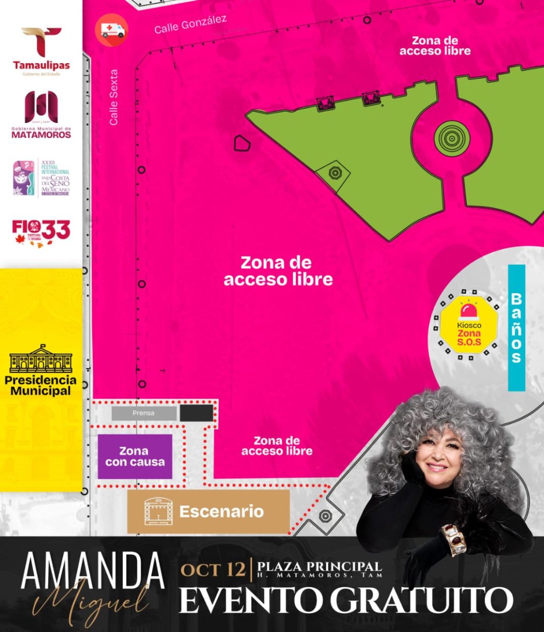 El Gobierno de Beto Granados dio a conocer el croquis oficial del concierto gratuito de Amanda Miguel, que se llevará a cabo este domingo 12 de octubre en la Plaza Principal.
