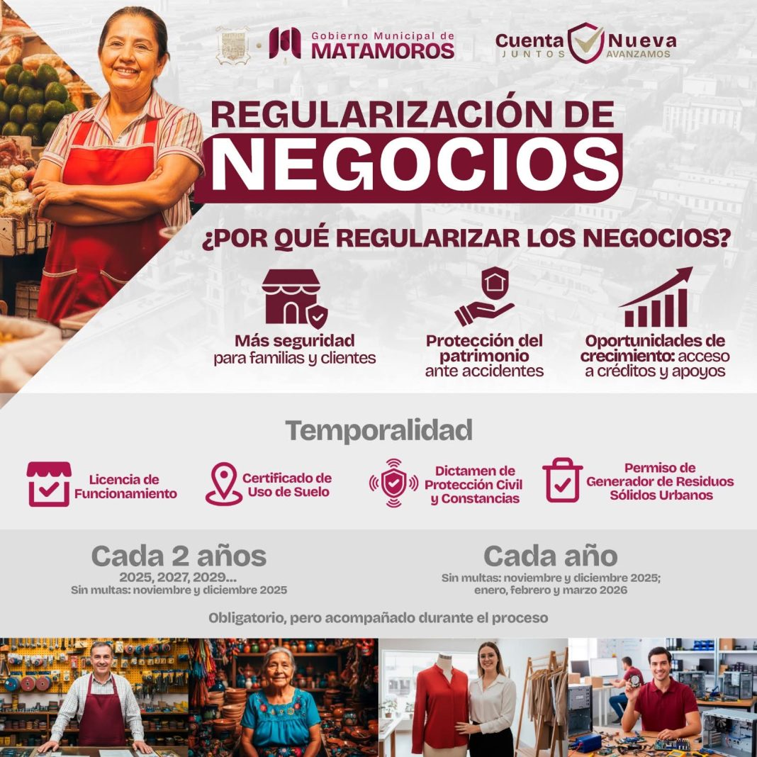 H. Matamoros, Tamaulipas.- El Gobierno de Beto Granados refrenda su compromiso con el desarrollo económico local y hace una invitación abierta a todas y todos los comerciantes para mantener en regla sus trámites y permisos. Regularizar un negocio representa una decisión clave que brinda tranquilidad, impulsa el crecimiento y fortalece la estabilidad del patrimonio de quienes apuestan por emprender y generar empleo en la ciudad.