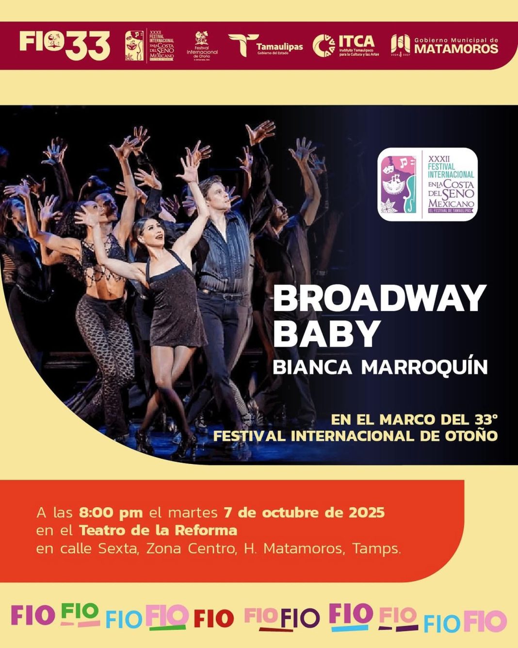 En el marco del Festival Internacional de la Costa del Seno Mexicano, el Gobierno de Beto Granados invita a las y los matamorenses a disfrutar del espectacular show “Broadway Baby”, protagonizado por la reconocida artista Bianca Marroquín, quien deleitará al público con una presentación llena de talento, música y emoción.