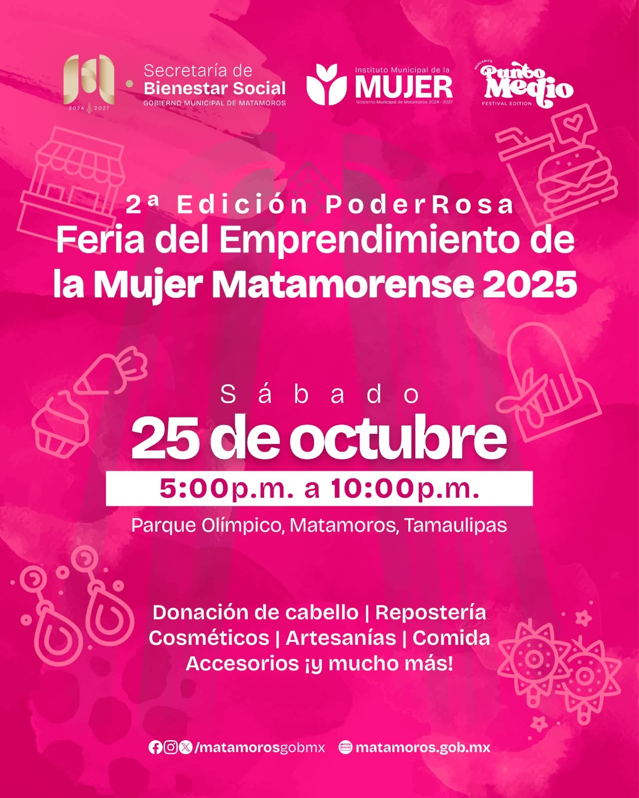 El Gobierno de Beto Granados invita a todas las familias matamorenses a participar en la Feria del Emprendimiento de la Mujer Matamorense 2025 “PoderRosa”, que se llevará a cabo este sábado 25 de octubre en el Parque Olímpico. Este evento busca reconocer y fortalecer el papel de las mujeres emprendedoras, quienes con su creatividad y esfuerzo contribuyen al Renacimiento de Matamoros y al impulso de la economía local.
