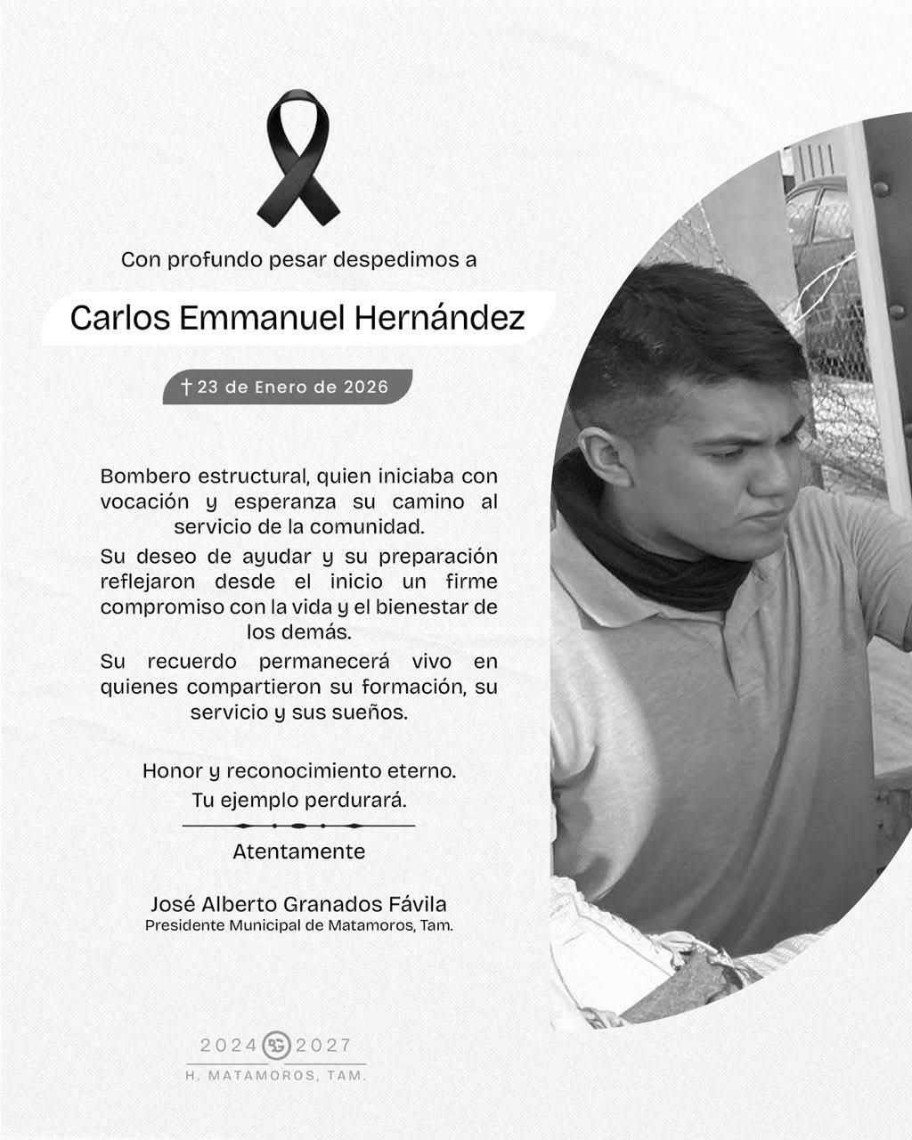 El Gobierno de Beto Granados expresa su más sincero pesar por el fallecimiento del joven elemento, reconociendo el honor y la entrega con la que Carlos Emmanuel asumió su responsabilidad como bombero. Su partida enluta a Matamoros y recuerda el alto compromiso que implica servir, incluso a costa de la propia vida.