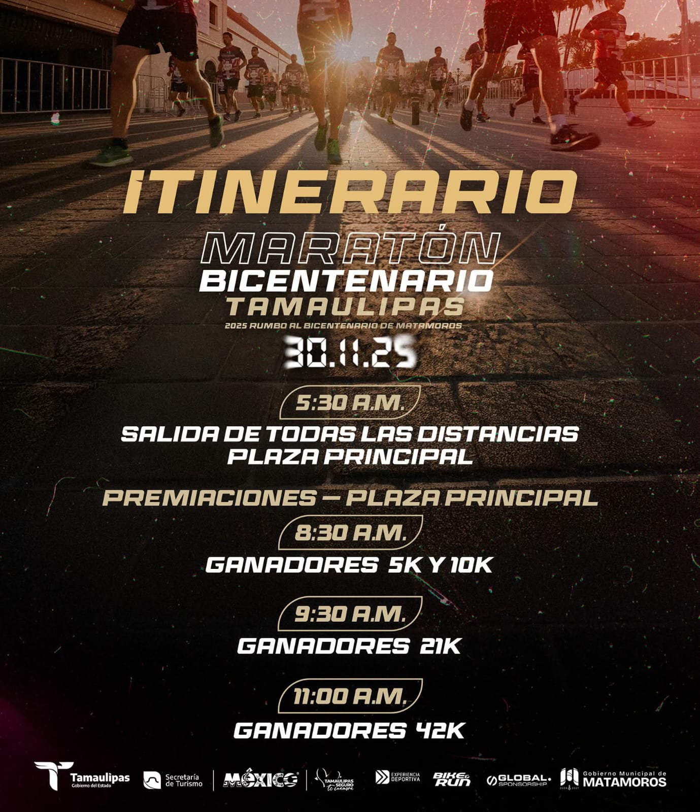 H. Matamoros, Tamaulipas.- El Gobierno de Beto Granados dio a conocer el itinerario oficial del Maratón Bicentenario Tamaulipas 2025, uno de los eventos deportivos más esperados en la región. La jornada se llevará a cabo el próximo 30 de noviembre en la Plaza Principal de Matamoros, donde se espera la participación de cientos de corredores y familias que se sumarán a esta celebración rumbo al Bicentenario.