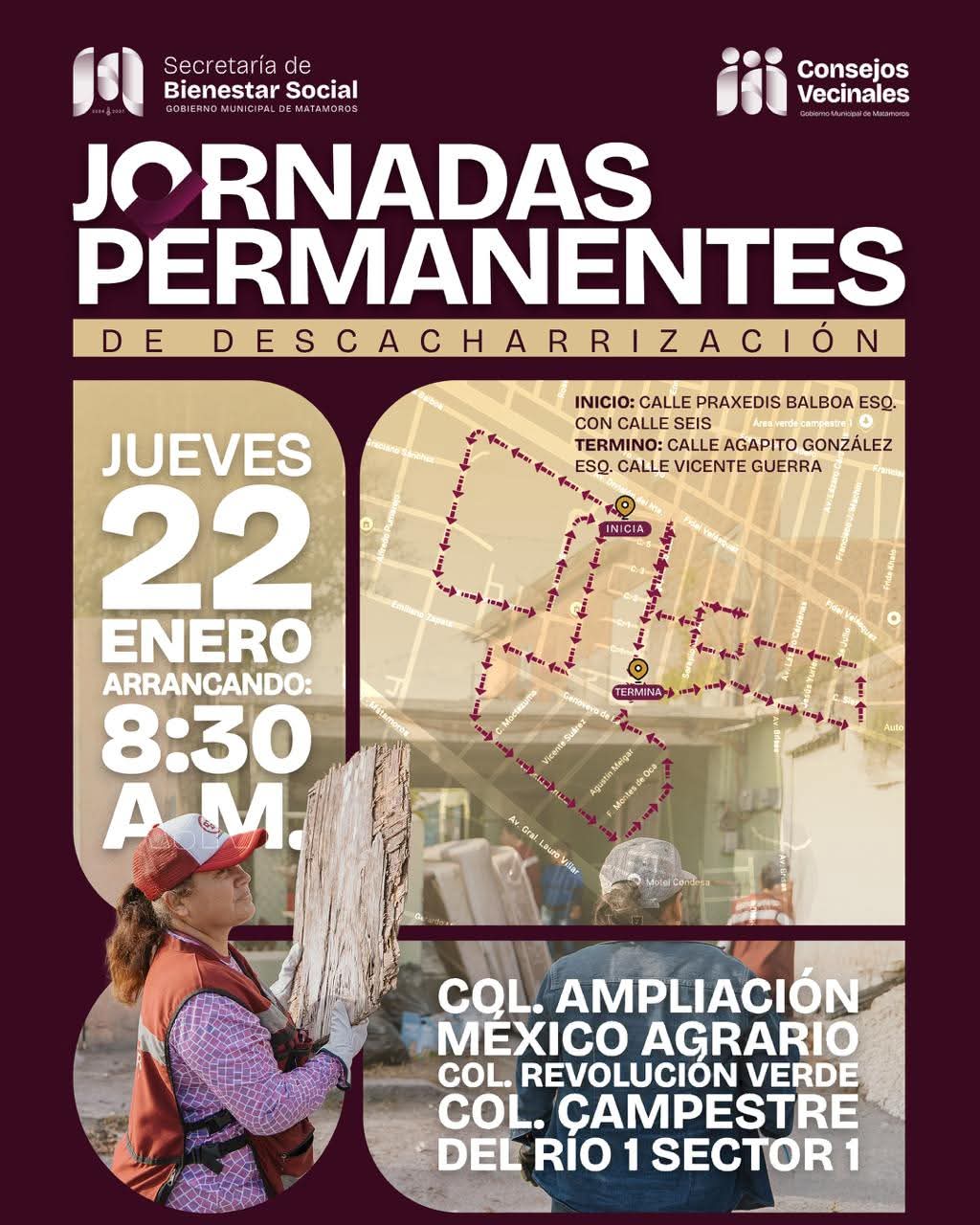 El Gobierno de Beto Granados, a través de la Secretaría de Bienestar Social y en coordinación con los Consejos Vecinales, llevará a cabo las Jornadas Permanentes de Descacharrización este jueves 22 de enero, con el objetivo de prevenir enfermedades transmitidas por vectores y fortalecer la salud pública en Matamoros.
