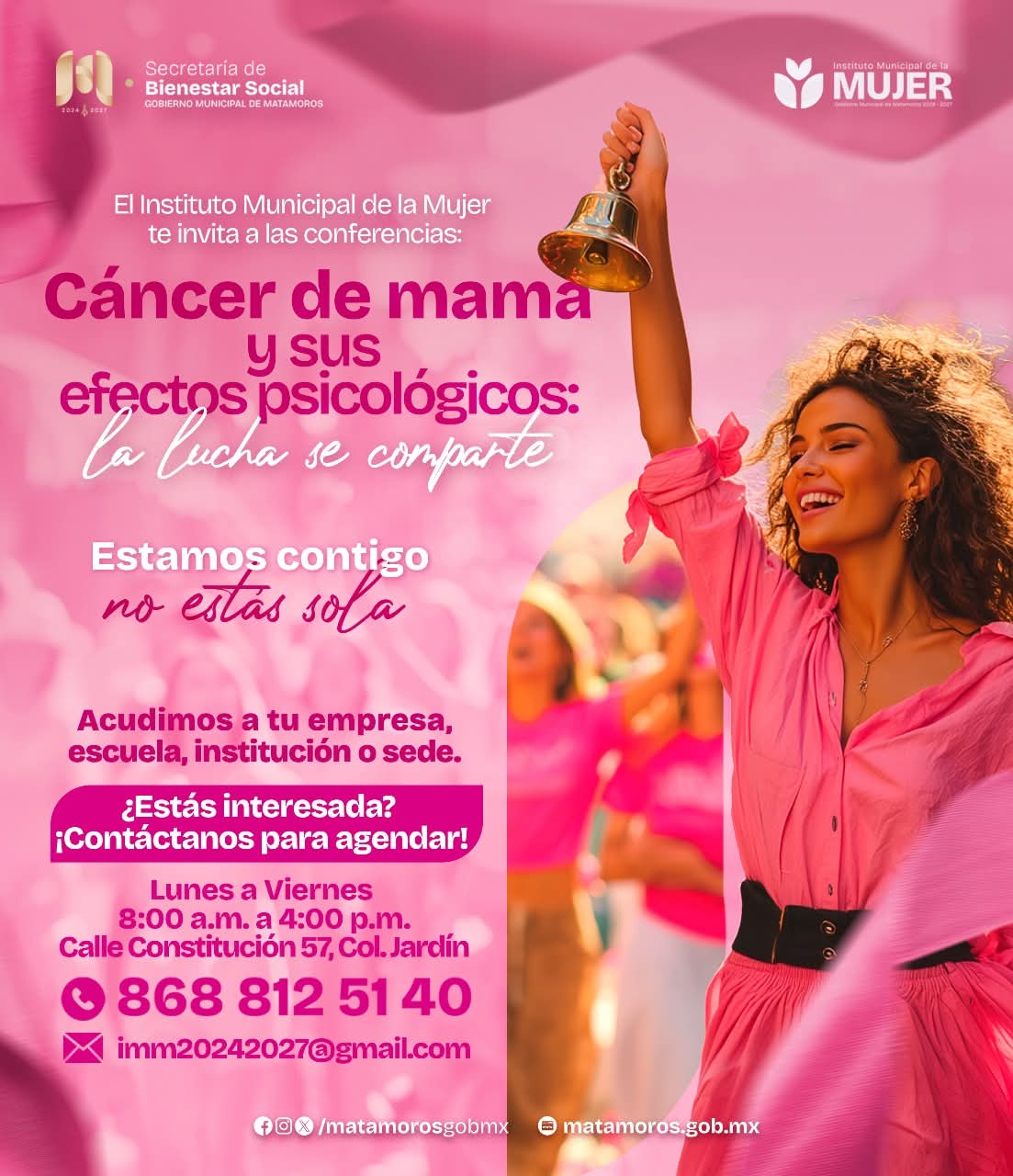 El gobierno de Matamoros, en coordinación con la Secretaría de Bienestar Social y del Instituto Municipal de la Mujer reafirma su compromiso de brindar información y acompañamiento sobre el cáncer de mama a través de conferencias como “Cáncer de mama y sus efectos psicológicos”.