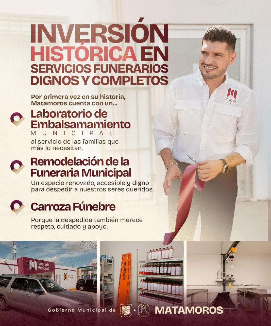En un esfuerzo sin precedentes por dignificar los servicios funerarios en Matamoros, el Gobierno Municipal que preside el alcalde, Beto Granados ha realizado una inversión histórica que marca un antes y un después en esta importante área de atención social. Por primera vez en la historia del municipio, las familias contarán con infraestructura y servicios públicos funerarios que garantizan el respeto, la calidad y la calidez humana en los momentos más difíciles.