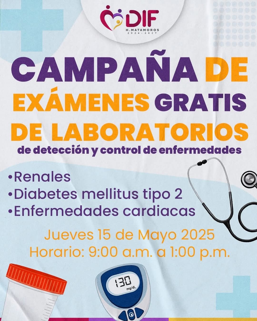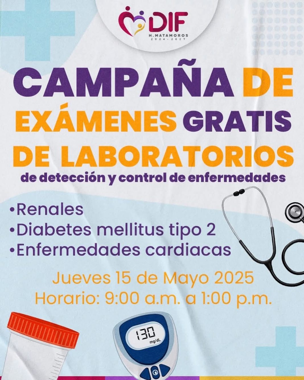Gobierno municipal y DIF Matamoros llevarán a cabo Campaña Gratuita de Exámenes de Laboratorio gratuitosEl Gobierno municipal, en coordinación con el Sistema para el Desarrollo Integral de la Familia (DIF), reiteró su compromiso con la salud y el bienestar de la población, mediante la realización de una campaña de exámenes de laboratorio gratuitos, dirigida a toda la ciudadanía interesada en conocer y cuidar su estado de salud.