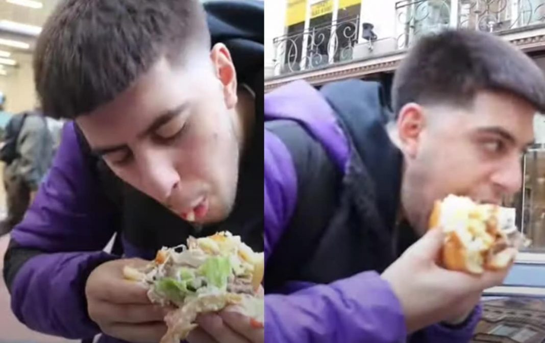 El video muestra varios fragmentos de cómo el influencer se come la hamburguesa frente a la protesta de veganos.