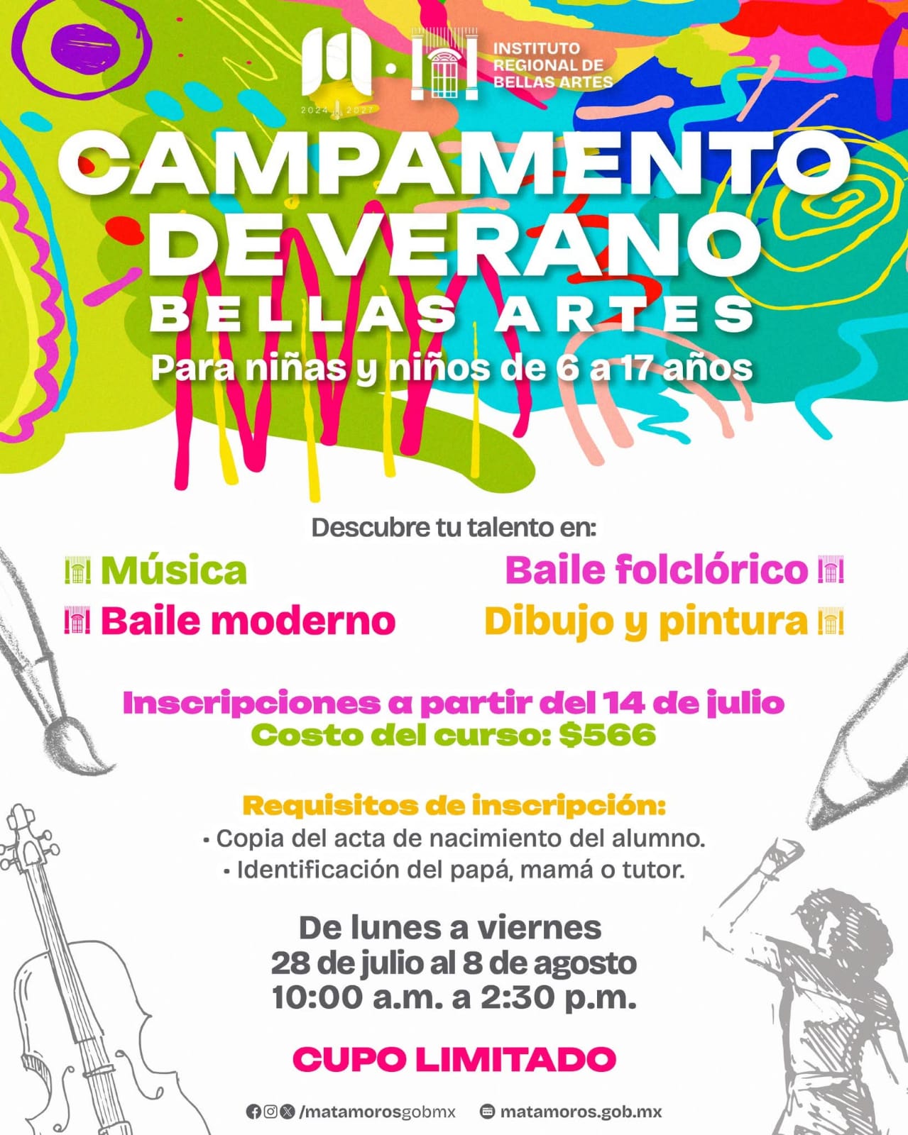 El Gobierno de Matamoros que preside Beto Granados anunció la apertura del Campamento de Verano Bellas Artes, una iniciativa dirigida a niñas, niños y jóvenes de entre 6 y 17 años que deseen desarrollar su talento artístico durante esta temporada vacacional.