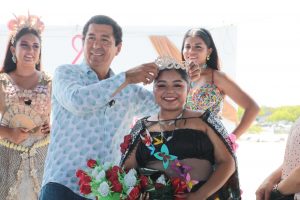 Durante su visita al Poblado Higuerillas, sede del evento, el alcalde Mario Alberto López Hernández y su esposa Marsella Huerta de López inauguraron la plaza dedicada al pescador y coronaron a la reina del festival, Gema Esperanza García, quien se presentó con un hermoso atuendo elaborado con materiales reciclables.