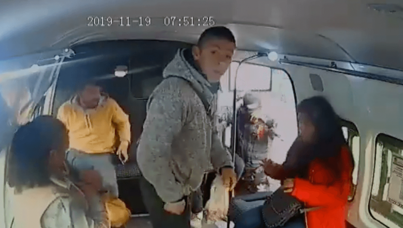 En la grabación de poco menos de un minuto de duración, se puede observar que el par de delincuentes, hacen la parada como si fueran usuarios regulares, sin embargo instantes después de abordar la unidad, uno de los sujetos exige a sus víctimas que les entreguen sus objetos de valor.