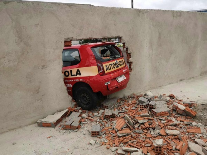 Este accidente sucedió en Paraná, Brasil. Un conductor que realizaba una prueba práctica tras tomar un curso para obtener la Licencia de Conducir Nacional, perdió el control del automóvil y se estrelló contra una pared del patio del Departamento de Tránsito, en el barrio Tarumã de Curitiba el miércoles por la mañana.