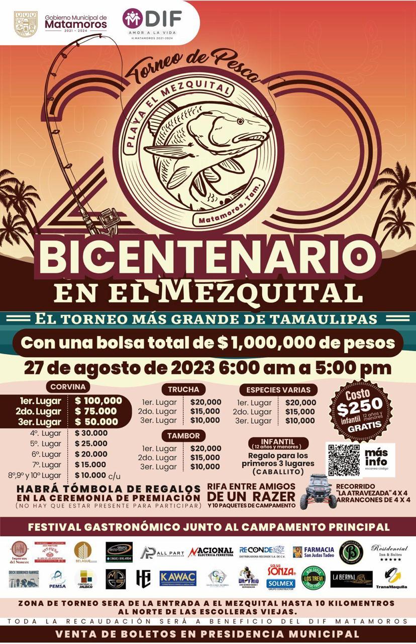 En el marco del Torneo de Pesca “Bicentenario” que organiza el Gobierno de Matamoros para el próximo 27 de agosto en El Mezquital, también se realizará un Festival Gastronómico, se otorgarán los mejores premios económicos por la captura de los mejores ejemplares, se rifará un vehículo razer, y se ofrecerán muchas actividades más.