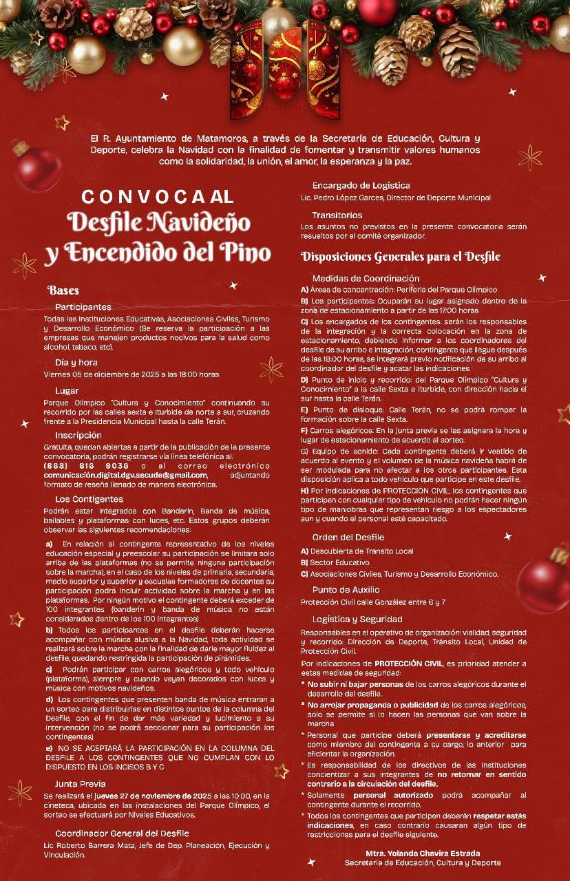 El presidente municipal Beto Granados, a través del Gobierno Municipal de Matamoros y la Secretaría de Educación, Cultura y Deporte, convoca a las instituciones educativas, asociaciones civiles y empresas a participar en el desfile navideño y encendido del pino 2025.