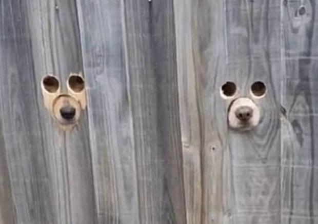 La mujer decidió cortar hoyos para los ojos y hocico de sus mascotas, unos perros labrador, para que a través de ellos los animales puedan asomarse y ver su auto entrar por el garaje, detalla el diario Mirror.