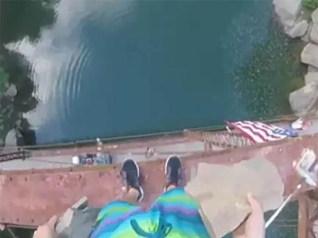 En el vídeo se puede ver cómo el saltador experimentado se mentaliza antes lanzando una de las piedras al río que pasa por debajo de dicho puente en Masontown, West Virginia, Estados Unidos