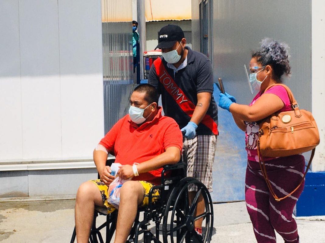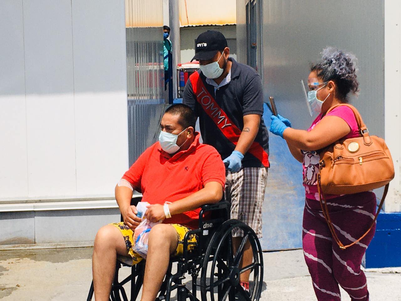 En compañía de dos familiares fueron quien lo recibieron al exterior del hospital covid en el Pumarejo en Matamoros Tamaulipas.